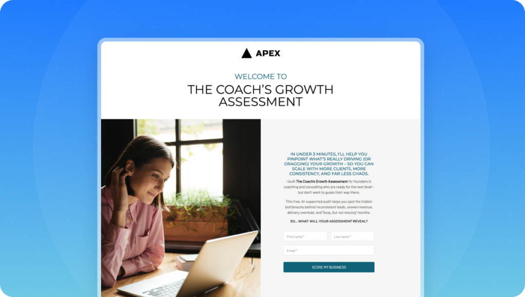 1. Steal Thea’s template as your starting point. We’ve made Thea’s scorecard available as a ready-to-clone ScoreApp template – the Coach Growth Assessment. Clone it, swap in your business, your questions, and your scoring logic, and you can have a version live in your own brand in a single working session. 👉 Clone the Coach Growth Assessment template